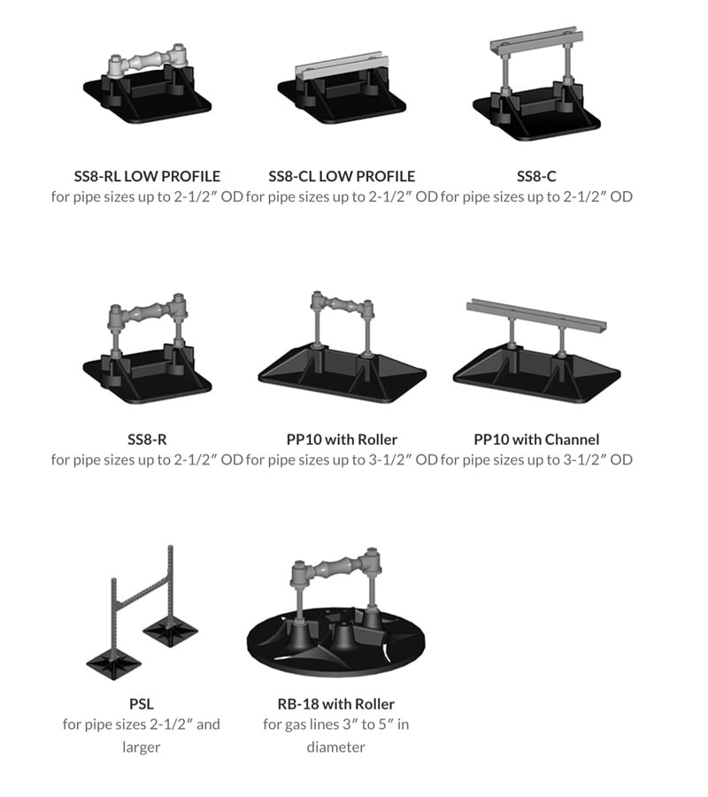 Pipe hangers and supports are designed for large and small gas pipes, electrical conduit and condensate drain lines, and refrigeration lines. Choose from adjustable and non-adjustable assemblies for high- or low-profile applications, and high-wind assemblies for extreme conditions.