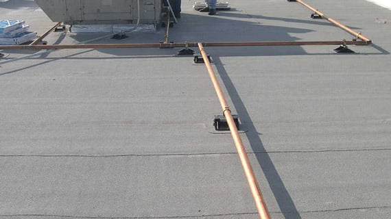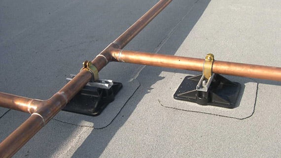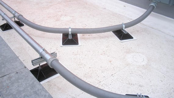 The SS8 w/ Channel Low Profile-model non-adjustable pipe supports are designed to support electrical conduit, condensate drain lines or small refrigeration lines up to 2 ½” OD, set at 3 ½” above the roof surface.